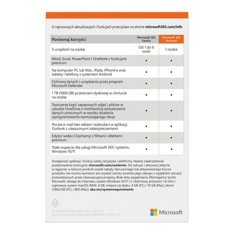 | Opis ogólny | Oprogramowanie Microsoft 365 Personal PL P10 1Y 1User/5Devices Win/Mac Box |